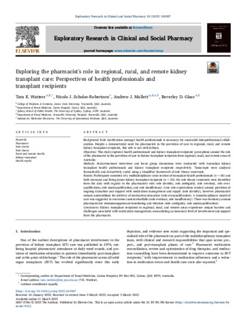 Watters, Tara K., Scholes-Robertson, Nicole J., Mallett, Andrew J., and Glass, Beverley D. (2025) Exploring the pharmacist's role in regional, rural, and remote kidney transplant care: Perspectives of health professionals and transplant recipients. Exploratory Research in Clinical and Social Pharmacy, 18. 100587.