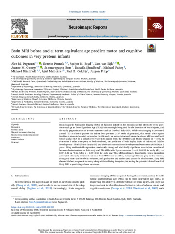 Pagnozzi, Alex M., Pannek, Kerstin, Boyd, Roslyn N., van Eijk, Liza, George, Joanne M., Bora, Samudragupta, Bradford, Dana Kai, Fahey, Michael, Ditchfield, Michael, Malhotra, Atul, Colditz, Paul B., and Fripp, Jurgen (2025) Brain MRI before and at term equivalent age predicts motor and cognitive outcomes in very preterm infants. Neuroimage: Reports, 5 (2). 100262.