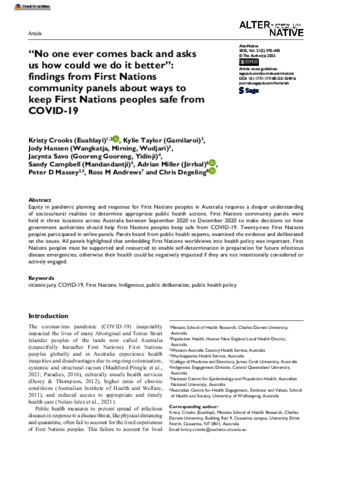 Crooks, Kristy, Taylor, Kylie, Hansen, Jody, Savo, Jacynta, Campbell, Sandy, Miller, Adrian, Massey, Peter D., Andrews, Ross M., and Degeling, Christopher (2025) “No one ever comes back and asks us how could we do it better”: findings from First Nations community panels about ways to keep First Nations peoples safe from COVID-19. AlterNative, 21 (2). pp. 392-405.