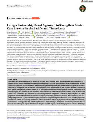 Bornstein, Sarah, Mitchell, Rob, McGloughlin, Steven, Wratten, Melanie, Hammad, Karen, Banks, Colin, Cameron, Peter, Dingle, Benjamin, Guirguis, Ann Maree, Guy, Chris, Hansell, Lamour, Jamieson, Jennifer, Koliwan, Arabella, McLean, Lewis, McLean, Naomi, Motofaga, Silina, Phillips, Georgina, Reid, Sally, Tacon, Cath, and O'Reilly, Gerard (2025) Using a Partnership-Based Approach to Strengthen Acute Care Systems in the Pacific and Timor-Leste. Emergency Medicine Australasia, 37 (3). e70063.