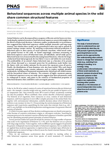 Minasandra, Pranav, Grout, Emily M., Brock, Katrina, Crofoot, Margaret C., Demartsev, Vlad, Gersick, Andrew S., Hirsch, Ben T., Holekamp, Kay E., Johnson-Ulrich, Lily, Nayak, Amlan, Ortega, Josué, Roch, Marie A., Strauss, Eli D., and Strandburg-Peshkin, Ariana (2025) Behavioral sequences across multiple animal species in the wild share common structural features. Proceedings of the National Academy of Sciences of the United States of America, 122 (20). e2503962122.