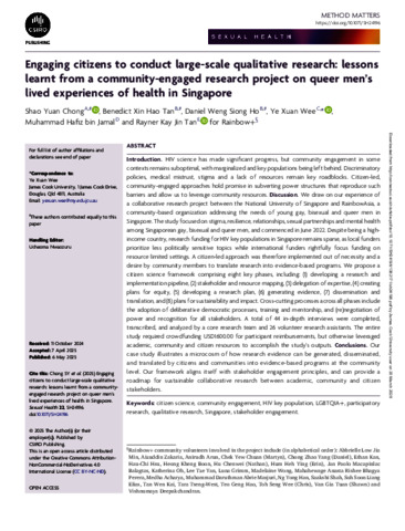Chong, Shao Yuan, Tan, Benedict Xin Hao, Ho, Daniel Weng Siong, Wee, Ye Xuan, bin Jamal, Muhammad Hafiz, Tan, Rayner Kay Jin, and UNSPECIFIED (2025) Engaging citizens to conduct large-scale qualitative research: lessons learnt from a community-engaged research project on queer men's lived experiences of health in Singapore. Sexual Health, 22 (3). SH24196.