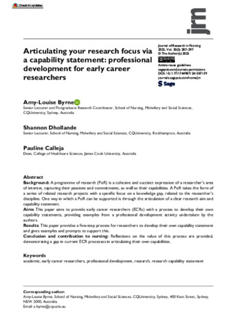 Byrne, Amy Louise, Dhollande, Shannon, and Calleja, Pauline (2025) Articulating your research focus via a capability statement: professional development for early career researchers. Journal of Research in Nursing, 30 (3). pp. 287-297.