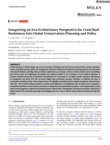 Howe-Kerr, L.I., and Quigley, K.M. (2025) Integrating an Eco-Evolutionary Perspective for Coral Reef Resistance Into Global Conservation Planning and Policy. Conservation Letters, 18 (3). e13108.