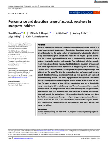 Kanno, Shiori, Heupel, Michelle R., Hoel, Kristin, Schlaff, Audrey, Siddiqi, Aliya, and Simpfendorfer, Colin A. (2025) Performance and detection range of acoustic receivers in mangrove habitats. Journal of Fish Biology, 106 (5). pp. 1540-1553.