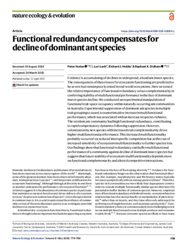 Yeeles, Peter, Lach, Lori, Hobbs, Richard J., and Didham, Raphael K. (2025) Functional redundancy compensates for decline of dominant ant species. Nature Ecology & Evolution, 9 (5). 5350. pp. 779-788.