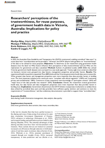 Riley, Merilyn, Kilkenny, Monique F., Robinson, Kerin, and Leggat, Sandra G. (2025) Researchers’ perceptions of the trustworthiness, for reuse purposes, of government health data in Victoria, Australia: Implications for policy and practice. Health Information Management Journal, 54 (2). pp. 139-149.