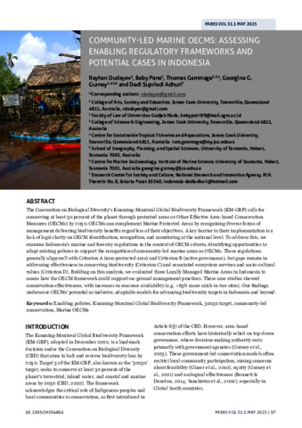 Dudayev, Rayhan, Pane, Beby, Gammage, Thomas, Gurney, Georgina G., and Adhuri, Dedi Supriadi (2025) Community-led marine OECMs: Assessing enabling regulatory frameworks and potential cases in Indonesia. Parks: the international journal of protected areas and coservation, 31 (1). pp. 97-108.