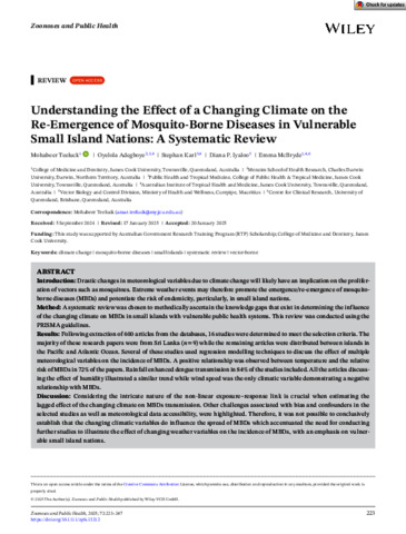 Teeluck, Mohabeer, Adegboye, Oyelola, Karl, Stephan, Iyaloo, Diana P., and McBryde, Emma (2025) Understanding the Effect of a Changing Climate on the Re-Emergence of Mosquito-Borne Diseases in Vulnerable Small Island Nations: A Systematic Review. Zoonoses and Public Health, 72 (3). pp. 223-247.
