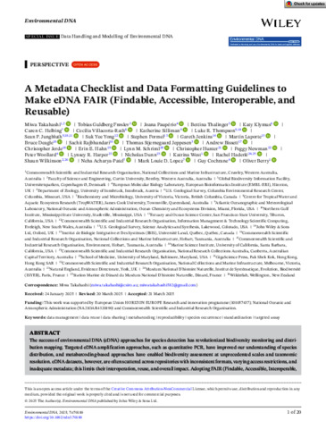 Takahashi, Miwa, Frøslev, Tobias Guldberg, Paupério, Joana, Thalinger, Bettina, Klymus, Katy, Helbing, Caren C., Villacorta-Rath, Cecilia, Silliman, Katherine, Thompson, Luke R., Jungbluth, Sean P., Yong, Suk Yee, Formel, Stephen, Jenkins, Gareth, Laporte, Martin, Deagle, Bruce, Rajbhandari, Sachit, Jeppesen, Thomas Stjernegaard, Bissett, Andrew, Jerde, Christopher, Hahn, Erin E., Schriml, Lynn M., Hunter, Christopher, Newman, Peggy, Woollard, Peter, Harper, Lynsey R., Dunn, Nicholas, West, Katrina, Haderlé, Rachel, Wilkinson, Shaun, Acharya-Patel, Neha, Lopez, Mark Louie D., Cochrane, Guy, and Berry, Oliver (2025) A Metadata Checklist and Data Formatting Guidelines to Make eDNA FAIR (Findable, Accessible, Interoperable, and Reusable). Environmental DNA, 7 (3). e70100.