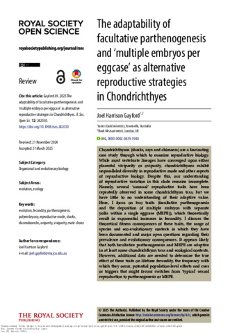 Gayford, Joel Harrison (2025) The adaptability of facultative parthenogenesis and 'multiple embryos per eggcase' as alternative reproductive strategies in Chondrichthyes. Royal Society Open Science, 12 (4). 242030.