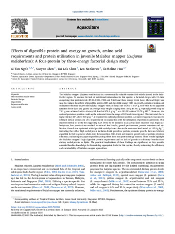 Ngoh, Si Yan, Shen, Xueyan, Chan, Tai Lok, Nankervis, Leo, and Hua, Katheline (2025) Effects of digestible protein and energy on growth, amino acid requirements and protein utilisation in juvenile Malabar snapper (Lutjanus malabaricus): A four-protein by three-energy factorial design study. Aquaculture, 600. 742200.
