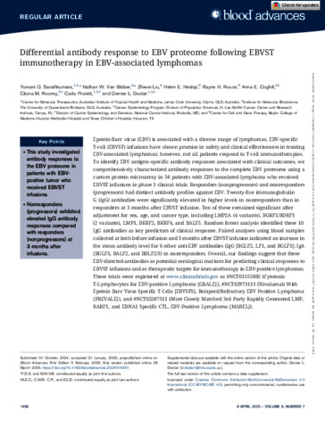 Sarathkumara, Yomani D., Van Bibber, Nathan W., Liu, Zhiwei, Heslop, Helen E., Rouce, Rayne H., Coghill, Anna E., Rooney, Cliona M., Proietti, Carla, and Doolan, Denise L. (2025) Differential antibody response to EBV proteome following EBVST immunotherapy in EBV-associated lymphomas. Blood Advances, 9 (7). pp. 1658-1669.