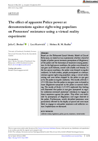 Becker, Julia C., Hartwich, Lea, and Radke, Helena R.M. (2025) The effect of apparent Police power at demonstrations against right-wing populism on Protestors' resistance using a virtual reality experiment. British Journal of Social Psychology, 64 (2). e12809.