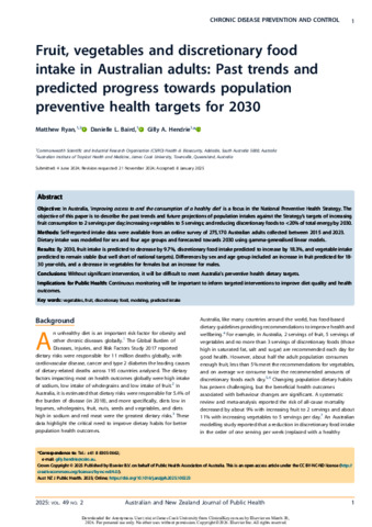 Ryan, Matthew, Baird, Danielle L., and Hendrie, Gilly A. (2025) Fruit, vegetables and discretionary food intake in Australian adults: Past trends and predicted progress towards population preventive health targets for 2030. Australian and New Zealand Journal of Public Health, 49 (2). 100223.