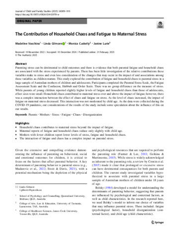 Vaschina, Madeline, Gilmore, Linda, Cuskelly, Monica, and Lurie, Janine (2025) The Contribution of Household Chaos and Fatigue to Maternal Stress. Journal of Child and Family Studies, 34 (4). pp. 909-919.