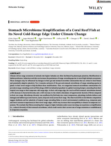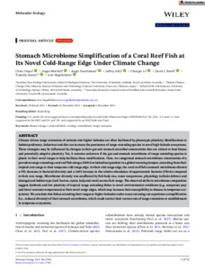 Hayes, Chloe, Mitchell, Angus, Huerlimann, Roger, Jolly, Jeffrey, Li, Chengze, Booth, David J., Ravasi, Timothy, and Nagelkerken, Ivan (2025) Stomach Microbiome Simplification of a Coral Reef Fish at Its Novel Cold-Range Edge Under Climate Change. Molecular Ecology, 34 (7). e17704.