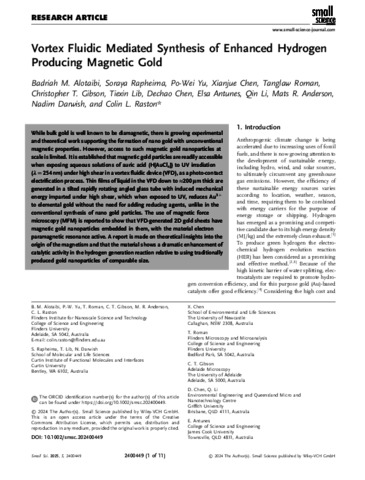 Alotaibi, Badriah M., Rapheima, Soraya, Yu, Po Wei, Chen, Xianjue, Roman, Tanglaw, Gibson, Christopher T., Lib, Tiexin, Chen, Dechao, Dos Santos Antunes, Elsa, Li, Qin, Anderson, Mats R., Darwish, Nadim, and Raston, Colin L. (2025) Vortex Fluidic Mediated Synthesis of Enhanced Hydrogen Producing Magnetic Gold. Small Science, 5 (4). 2400449.