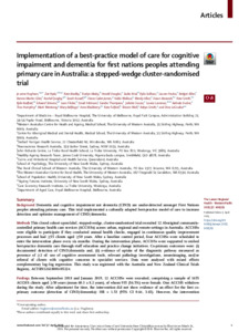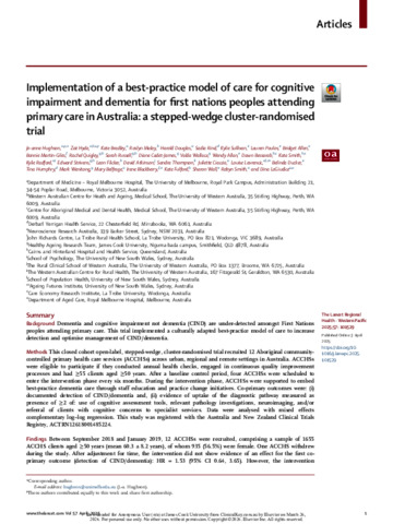 Hughson, Jo-anne, Hyde, Zoë, Bradley, Kate, Malay, Roslyn, Douglas, Harold, Rind, Sadia, Sullivan, Kylie, Poulos, Lauren, Allen, Bridget, Martin-Giles, Bonnie, Quigley, Rachel, Russell, Sarah, Cadet-James, Diane, Wallace, Valda, Allan, Wendy, Bessarab, Dawn, Smith, Kate, Radford, Kylie, Strivens, Edward, Flicker, Leon, Atkinson, David, Thompson, Sandra, Ciaccia, Juliette, Lavrencic, Louise, Ducker, Belinda, Humphry, Tina, Wenitong, Mark, Belfrage, Mary, Blackberry, Irene, Fulford, Kate, Wall, Sharon, Smith, Robyn, and LoGiudice, Dina (2025) Implementation of a best-practice model of care for cognitive impairment and dementia for first nations peoples attending primary care in Australia: a stepped-wedge cluster-randomised trial. The Lancet Regional Health - Western Pacific, 57. 101529.