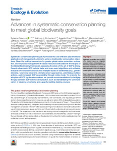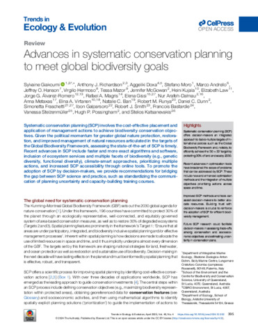 Giakoumi, Sylvaine, Richardson, Anthony J., Doxa, Aggeliki, Moro, Stefano, Andrello, Marco, Hanson, Jeffrey O., Hermoso, Virgilio, Mazor, Tessa, McGowan, Jennifer, Kujala, Heini, Law, Elizabeth, Alvarez-Romero, Jorge G., Magris, Rafael A., Gissi, Elena, Arafeh-Dalmau, Nur, Metaxas, Anna, Virtanen, Elina A., Ban, Natalie C., Runya, Robert M., Dunn, Daniel C., Fraschetti, Simonetta, Galparsoro, Ibon, Smith, Robert J., Bastardie, Francois, Stelzenmüller, Vanessa, Possingham, Hugh P., and Katsanevakis, Stelios (2025) Advances in systematic conservation planning to meet global biodiversity goals. Trends in Ecology and Evolution, 40 (4). pp. 395-410.
