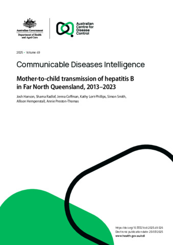 Hanson, Josh, Radlof, Sharna, Coffman, Jenna, Lort-Phillips, Kathy, Smith, Simon, Hempenstall, Allison, and Preston-Thomas, Annie (2025) Mother-to-child transmission of hepatitis B in Far North Queensland, 2013-2023. Communicable Diseases Intelligence, 49.