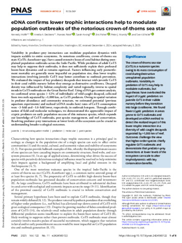 Wolfe, Kennedy, Desbiens, Amelia A., Patel, Frances, Kwong, Sarah, Fisher, Eric, Mumby, Peter J., Uthicke, Sven, and Knowlton, Nancy (2025) eDNA confirms lower trophic interactions help to modulate population outbreaks of the notorious crown-of-thorns sea star. Proceedings of the National Academy of Sciences of the United States of America, 122 (11). e2424560122.