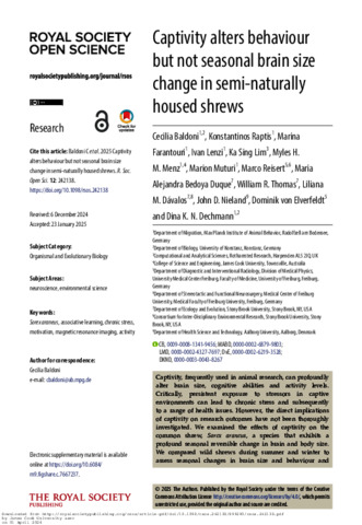 Baldoni, Cecilia, Raptis, Konstantinos, Farantouri, Marina, Lenzi, Ivan, Lim, Ka Sing, Menz, Myles H.M., Muturi, Marion, Reisert, Marco, Bedoya Duque, Maria Alejandra, Thomas, William R., Dávalos, Liliana M., Nieland, John D., Von Elverfeldt, Dominik, and Dechmann, Dina K.N. (2025) Captivity alters behaviour but not seasonal brain size change in semi-naturally housed shrews. Royal Society Open Science, 12 (3). 242138.