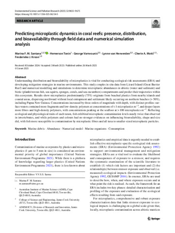 Santana, Marina F.M., Tonin, Hemerson, Vamvounis, George, van Herwerden, Lynne, Motti, Cherie A., and Kroon, Frederieke J. (2025) Predicting microplastic dynamics in coral reefs: presence, distribution, and bioavailability through field data and numerical simulation analysis. Environmental Science and Pollution Research, 32 (15). pp. 9655-9675.