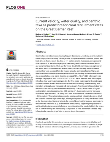 Drake, Matilde A., Noonan, Sam H.C., Alvarez-Noriega, Mariana, Rashid, Ahmad R., and Fabricius, Katharina E. (2025) Current velocity, water quality, and benthic taxa as predictors for coral recruitment rates on the Great Barrier Reef. PLoS ONE, 20 (3 March). e0319521.