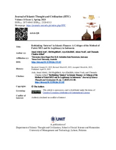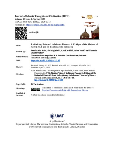 Aziz, Jamal Abdul, Maghfiroh, Siti, Kholifah, Ayu, Voak, Adam, and Althof, Chamada Chaidar (2025) Rethinking ‘Interest’ in Islamic Finance:A Critique of the Method of Fatwâ MUI and Its Legitimacy in Indonesia. Journal of Islamic Thought and Civilization, 15 (1). pp. 81-98.