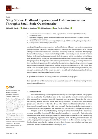 Harris, Richard J., Saggiomo, Silvia L., Paxton, Gillian, and Motti, Cherie A. (2025) Sting Stories: Firsthand Experiences of Fish Envenomation Through a Small-Scale Questionnaire. Toxins, 17 (3). 134.