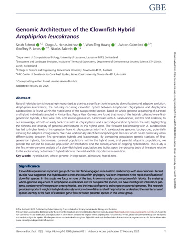 Schmid, Sarah, Hartasánchez, Diego A., Huang, Wan Ting, Gainsford, Ashton, Jones, Geoffrey P., and Salamin, Nicolas (2025) Genomic Architecture of the Clownfish Hybrid Amphiprion leucokranos. Genome Biology and Evolution, 17 (3). evaf031.