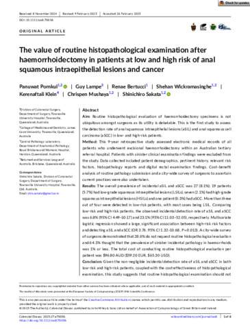 Pornkul, Panuwat, Lampe, Guy, Bertucci, Renae, Wickramasinghe, Shehan, Klein, Kerenaftali, Mushaya, Chrispen, and Sakata, Shinichiro (2025) The value of routine histopathological examination after haemorrhoidectomy in patients at low and high risk of anal squamous intraepithelial lesions and cancer. Colorectal Disease, 27 (3). e70056.