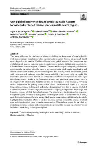 De Wysiecki, Agustín M., Barnett, Adam, Sánchez-Carnero, Noela, Cortés, Federico, Milessi, Andrés C., Trobbiani, Gastón A., and Jaureguizar, Andrés J. (2025) Using global occurrence data to predict suitable habitats for widely distributed marine species in data-scarce regions. Biodiversity and Conservation, 34 (4). 106155. pp. 1497-1523.
