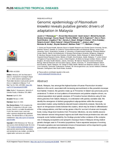 Westaway, Jacob A.F., Benavente, Ernest Diez, Auburn, Sarah, Kucharski, Michal, Aranciaga, Nicolas, Nayak, Sourav, William, Timothy, Rajahram, Giri S., Piera, Kim A., Braima, Kamil, Tan, Angelica F., Alaza, Danshy A., Barber, Bridget E., Drakeley, Christopher, Amato, Roberto, Sutanto, Edwin, Trimarsanto, Hidayat, Jelip, Jenarun, Anstey, Nicholas M., Bozdech, Zbynek, Field, Matthew, and Grigg, Matthew J. (2025) Genomic epidemiology of Plasmodium knowlesi reveals putative genetic drivers of adaptation in Malaysia. PLoS Neglected Tropical Diseases, 19 (3). e0012885.