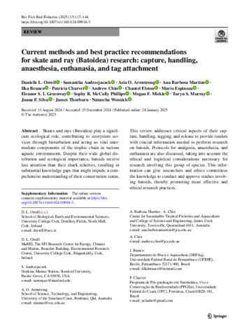 Orrell, Danielle L., Andrzejaczek, Samantha, Armstrong, Asia O., Barbosa Martins, Ana, Branco, Ilka, Charvet, Patricia, Chin, Andrew, Elston, Chantel, Espinoza, Mario, Greenway, Eleanor S.I., McCully Phillips, Sophy R., Mickle, Megan F., Murray, Taryn S., Silva, Joana F., Thorburn, James, and Wosnick, Natascha (2025) Current methods and best practice recommendations for skate and ray (Batoidea) research: capture, handling, anaesthesia, euthanasia, and tag attachment. Reviews in Fish Biology and Fisheries, 35 (1). pp. 117-144.