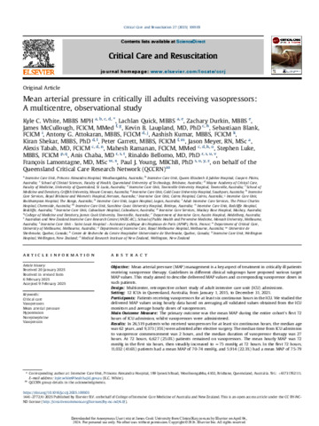 White, Kyle C., Quick, Lachlan, Durkin, Zachary, Mccullough, James, Laupland, Kevin B., Blank, Sebastiaan, Attokaran, Antony G., Kumar, Aashish, Shekar, Kiran, Garrett, Peter, Meyer, Jason, Tabah, Alexis, Ramanan, Mahesh, Luke, Stephen, Chaba, Anis, Bellomo, Rinaldo, Lamontagne, François, and Young, Paul J. (2025) Mean arterial pressure in critically ill adults receiving vasopressors: A multicentre, observational study. Critical Care and Resuscitation, 27 (1). 100103.