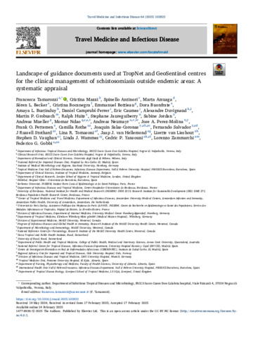 Tamarozzi, Francesca, Mazzi, Cristina, Antinori, Spinello, Arsuaga, Marta, Becker, Sören L., Bocanegra, Cristina, Bottieau, Emmanuel, Buonfrate, Dora, Bustinduy, Amaya L., Camprubí-Ferrer, Daniel, Caumes, Eric, Duvignaud, Alexandre, Grobusch, Martin P., Huits, Ralph, Jaureguiberry, Stephane, Jordan, Sabine, Mueller, Andreas, Ndao, Momar, Neumayr, Andreas, Perez-Molina, Jose A., Pettersen, Frank O., Rothe, Camilla, Salas-Coronas, Joaquin, Salvador, Fernando, Stothard, J. Russell, Tomasoni, Lina R., Van Hellemond, Jaap J., van Lieshout, Lisette, Vaughan, Stephen D., Wammes, Linda J., Yansouni, Cedric P., Zammarchi, Lorenzo, and Gobbi, Federico G. (2025) Landscape of guidance documents used at TropNet and GeoSentinel centres for the clinical management of schistosomiasis outside endemic areas: A systematic appraisal. Travel Medicine and Infectious Disease, 64. 102822.