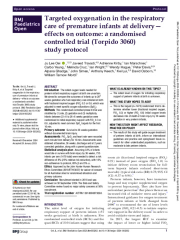 Oei, Ju Lee, Travadi, Javeed, Kirby, Adrienne, Marschner, Ian, Yeung, Carbo, Cruz, Melinda, Wright, Ian, Hague, Wendy, Davis, Peter, Ghadge, Alpana, Simes, John, Keech, Anthony, Lui, Kei, Osborn, David, and Mordi, William Tarnow (2025) Targeted oxygenation in the respiratory care of premature infants at delivery—effects on outcome: a randomised controlled trial (Torpido 3060) study protocol. BMJ Paediatrics Open, 9 (1). e003262.