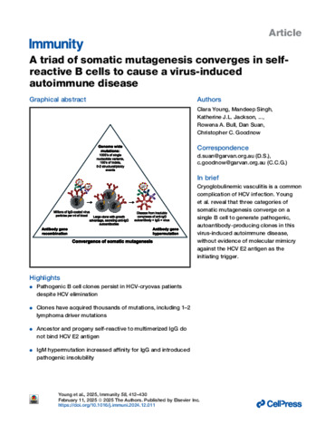 Young, Clara, Singh, Mandeep, Jackson, Katherine J.L., Field, Matt A., Peters, Timothy J., Angioletti-Uberti, Stefano, Frenkel, Daan, Ravishankar, Shyamsundar, Gupta, Money, Wang, Jing J., Agapiou, David, Faulks, Megan L., Al-Eryani, Ghamdan, Luciani, Fabio, Gordon, Tom P., Reed, Joanne H., Danta, Mark, Carr, Andrew, Kelleher, Anthony D., Dore, Gregory J., Matthews, Gail, Brink, Robert, Bull, Rowena A., Suan, Dan, and Goodnow, Christopher C. (2025) A triad of somatic mutagenesis converges in self-reactive B cells to cause a virus-induced autoimmune disease. Immunity, 58 (2). 412-430.e10.
