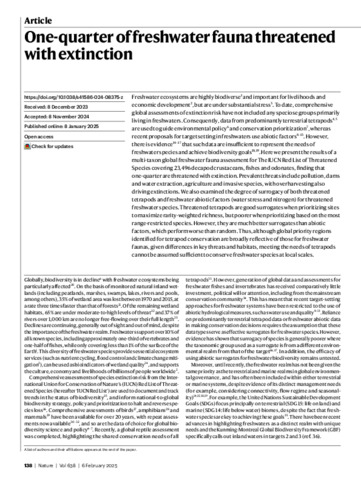 Sayer, Catherine A., Fernando, Eresha, Jimenez, Randall R., Macfarlane, Nicholas B.W., Rapacciuolo, Giovanni, Böhm, Monika, Brooks, Thomas M., Contreras-MacBeath, Topiltzin, Cox, Neil A., Harrison, Ian, Hoffmann, Michael, Jenkins, Richard, Smith, Kevin G., Vié, Jean Christophe, Abbott, John C., Allen, David J., Allen, Gerald R., Barrios, Violeta, Boudot, Jean Pierre, Carrizo, Savrina F., Charvet, Patricia, Clausnitzer, Viola, Congiu, Leonardo, Crandall, Keith A., Cumberlidge, Neil, Cuttelod, Annabelle, Dalton, James, Daniels, Adam G., De Grave, Sammy, De Knijf, Geert, Dijkstra, Klaas Douwe B., Dow, Rory A., Freyhof, Jörg, García, Nieves, Gessner, Joern, Getahun, Abebe, Gibson, Claudine, Gollock, Matthew J., Grant, Michael I., Groom, Alice E.R., Hammer, Michael P., Hammerson, Geoffrey A., Hilton-Taylor, Craig, Hodgkinson, Laurel, Holland, Robert A., Jabado, Rima W., Juffe Bignoli, Diego, Kalkman, Vincent J., Karimov, Bakhtiyor K., Kipping, Jens, Kottelat, Maurice, Lalèyè, Philippe A., Larson, Helen K., Lintermans, Mark, Lozano, Federico, Ludwig, Arne, Lyons, Timothy J., Máiz-Tomé, Laura, Molur, Sanjay, Ng, Heok Hee, Numa, Catherine, Palmer-Newton, Amy F., Pike, Charlotte, Pippard, Helen E., Polaz, Carla N.M., Pollock, Caroline M., Raghavan, Rajeev, Rand, Peter S., Ravelomanana, Tsilavina, Reis, Roberto E., Rigby, Cassandra L., Scott, Janet A., Skelton, Paul H., Sloat, Matthew R., Snoeks, Jos, Stiassny, Melanie L.J., Tan, Heok Hui, Taniguchi, Yoshinori, Thorstad, Eva B., Tognelli, Marcelo F., Torres, Armi G., Torres, Yan, Tweddle, Denis, Watanabe, Katsutoshi, Westrip, James R.S., Wright, Emma G.E., Zhang, E., and Darwall, William R.T. (2025) One-quarter of freshwater fauna threatened with extinction. Nature, 638 (8049). pp. 138-145.