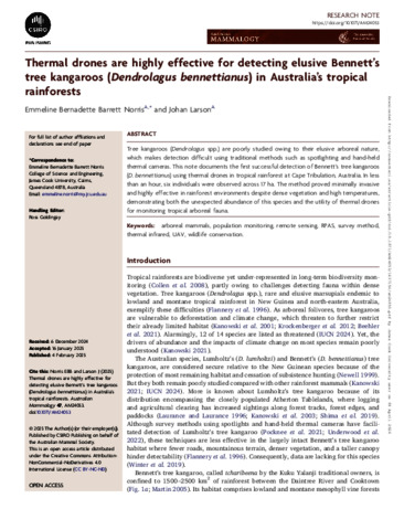 Norris, Emmeline Bernadette Barrett, and Larson, Johan (2025) Thermal drones are highly effective for detecting elusive Bennett's tree kangaroos (Dendrolagus bennettianus) in Australia's tropical rainforests. Australian Mammalogy, 47 (1). AM24053.