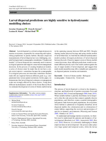 Choukroun, Severine, Stewart, Owen B., Mason, Luciano B., and Bode, Michael (2025) Larval dispersal predictions are highly sensitive to hydrodynamic modelling choices. Coral Reefs, 44 (1). pp. 1-13.