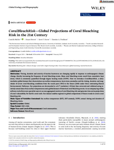 Mellin, Camille, Brown, Stuart, Heron, Scott F., and Fordham, Damien A. (2025) CoralBleachRisk—Global Projections of Coral Bleaching Risk in the 21st Century. Global Ecology and Biogeography, 34 (2). e13955.