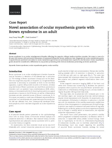 Wang, Amy Tianyi, and Goodwin, Todd (2025) Novel association of ocular myasthenia gravis with Brown syndrome in an adult. Journal of Surgical Case Reports, 2025 (2). rjaf059.