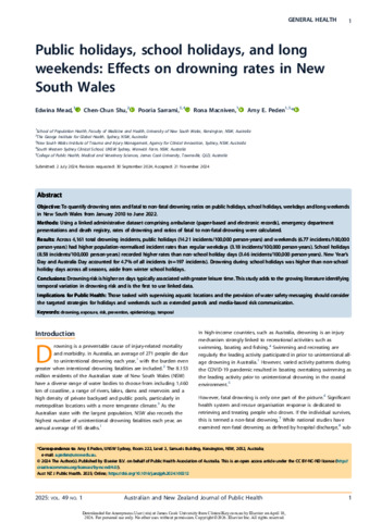 Mead, Edwina, Shu, Chen Chun, Sarrami, Pooria, Macniven, Rona, and Peden, Amy E. (2025) Public holidays, school holidays, and long weekends: Effects on drowning rates in New South Wales. Australian and New Zealand Journal of Public Health, 49 (1). 100212.