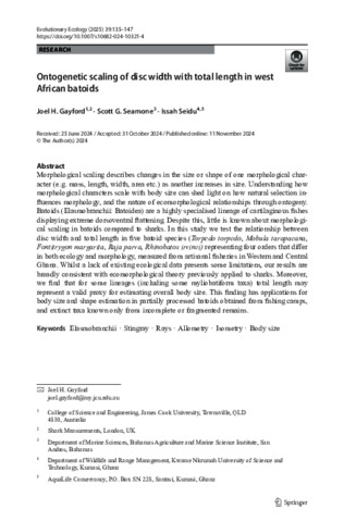 Gayford, Joel, Seamone, Scott G., and Seidu, Issah (2025) Ontogenetic scaling of disc width with total length in west African batoids. Evolutionary Ecology, 39 (1). pp. 135-147.