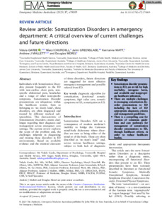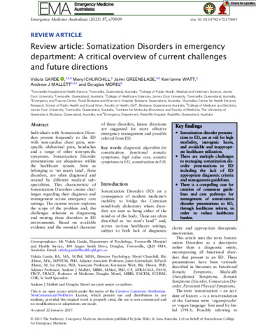 Garde, Vidula, Churchill, Meryl, Greenslade, Jaimi, Watt, Kerrianne, Mallett, Andrew J., and Morel, Douglas (2025) Review article: Somatization Disorders in emergency department: A critical overview of current challenges and future directions. Emergency Medicine Australasia, 37 (1). e70009.