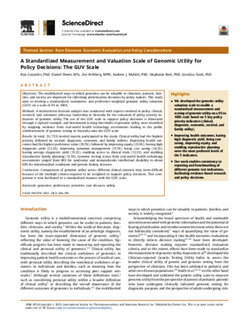 Goranitis, Ilias, Sheen, Daniel, Fehlberg, Zoe, Mallett, Andrew J., Best, Stephanie, and Stark, Zornitza (2025) A Standardized Measurement and Valuation Scale of Genomic Utility for Policy Decisions: The GUV Scale. Value in Health, 28 (2). pp. 184-190.