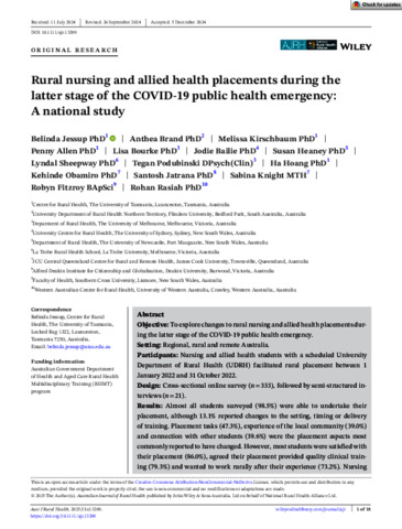 Jessup, Belinda, Brand, Anthea, Kirschbaum, Melissa, Allen, Penny, Bourke, Lisa, Bailie, Jodie, Heaney, Susan, Sheepway, Lyndal, Podubinski, Tegan, Hoang, Ha, Obamiro, Kehinde, Jatrana, Santosh, Knight, Sabina, Fitzroy, Robyn, and Rasiah, Rohan (2025) Rural nursing and allied health placements during the latter stage of the COVID-19 public health emergency: A national study. Australian Journal of Rural Health, 33 (1). e13209.